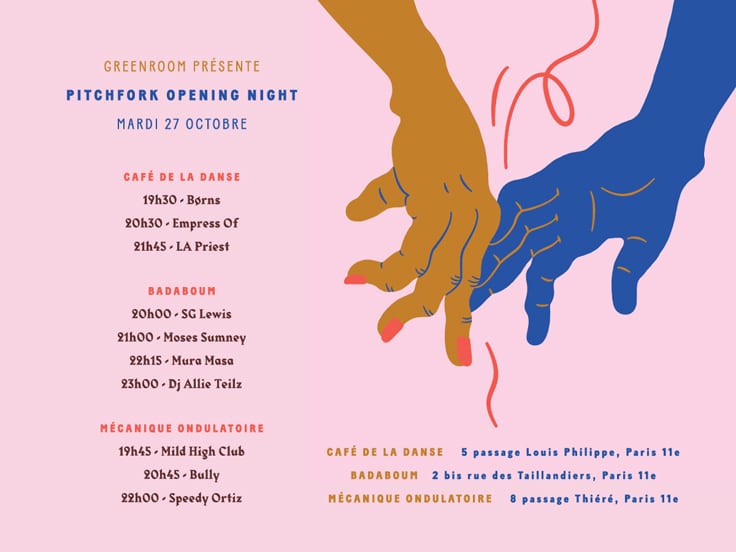 Pour sa 5ème édition, le Pitchfork Music Festival Paris a revisité le format de sa soirée d’ouverture : l’Opening Night sera cette année une soirée itinérante dans le 11ème arrondissement, entre le Café de La Danse, le Badaboum et La Mécanique Ondulatoire. De 19h à minuit vous pourrez circuler entre les trois salles, à 2 minutes à pied l’une de l’autre, et découvrir dix artistes de la scène internationale de demain.