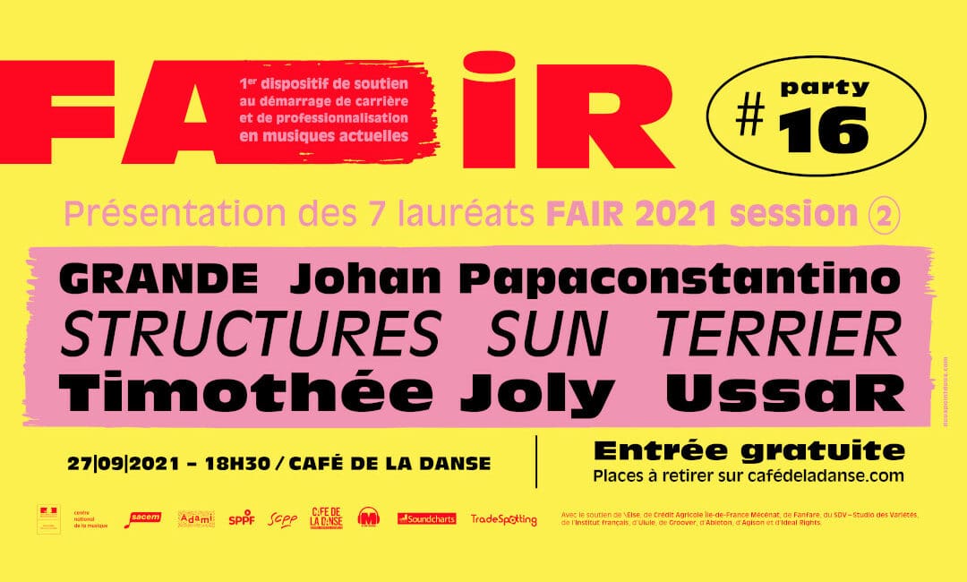 Le fair, 1er dispositif de soutien au démarrage de carrière et de professionnalisation en musiques actuelles, est heureux de vous présenter ses nouveaux lauréats lors de sa 16ème « Fair : Party » au Café De la Danse. Chacun des 7 lauréats du Fair 2021 session #2 interprétera quelques titres :