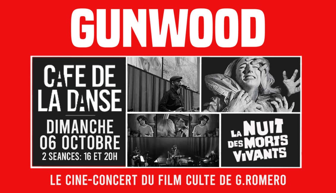 Au cœur de la campagne américaine, une étrange épidémie se propage et oblige les habitants à s’enfermer pour sauver leur peau… Sorti en 1968, La Nuit des morts-vivants de Georges A. Romero est un film culte à bien des égards : il a popularisé la figure du zombie, a rebattu les cartes du cinéma d’horreur en lançant la mode du gore, et est l’un des rares long-métrages de l’époque à confier son rôle principal à un acteur noir. Imprégné depuis toujours des paysages dont sort tout droit le film, Gunwood imagine une nouvelle bande originale pour ce bijou de culture pop, sans tomber dans le simple exercice d’accompagnement ni cantonner l’image au statut de décor. Modernisé, redynamisé par un nouveau montage des Frères Berner, le film est projeté sur un écran au format cinémascope au-dessus des musiciens, sur le même plan qu’eux. La musique, associant chansons blues, moments atmosphériques et montées en puissance rock, est entremêlée à la fiction, de telle sorte qu’elle semble en faire partie. Revisitant le format du ciné-concert, le résultat est une œuvre à part entière qui propose une expérience immersive innovante, à la fois visuelle et sonore.
