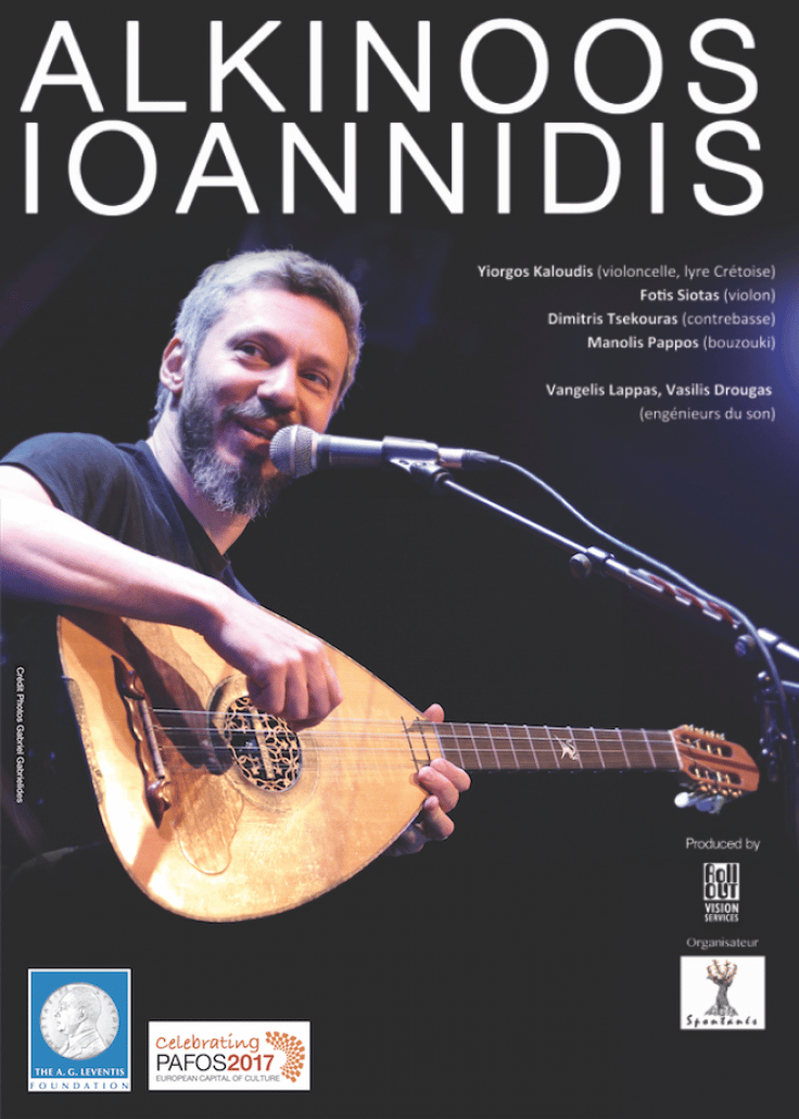 Alkinoos Ioannidis, l’auteur-compositeur et interprète le plus apprécié de Grèce, donnera un concert le 15 Octobre 2017 au Café de la Danse, à Paris. Organisé dans le cadre des célébrations de la Capitale Européenne de la Culture à Chypre «Pafos 2017», le concert est soutenu par la Fondation A.G. Leventis.