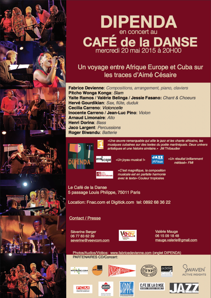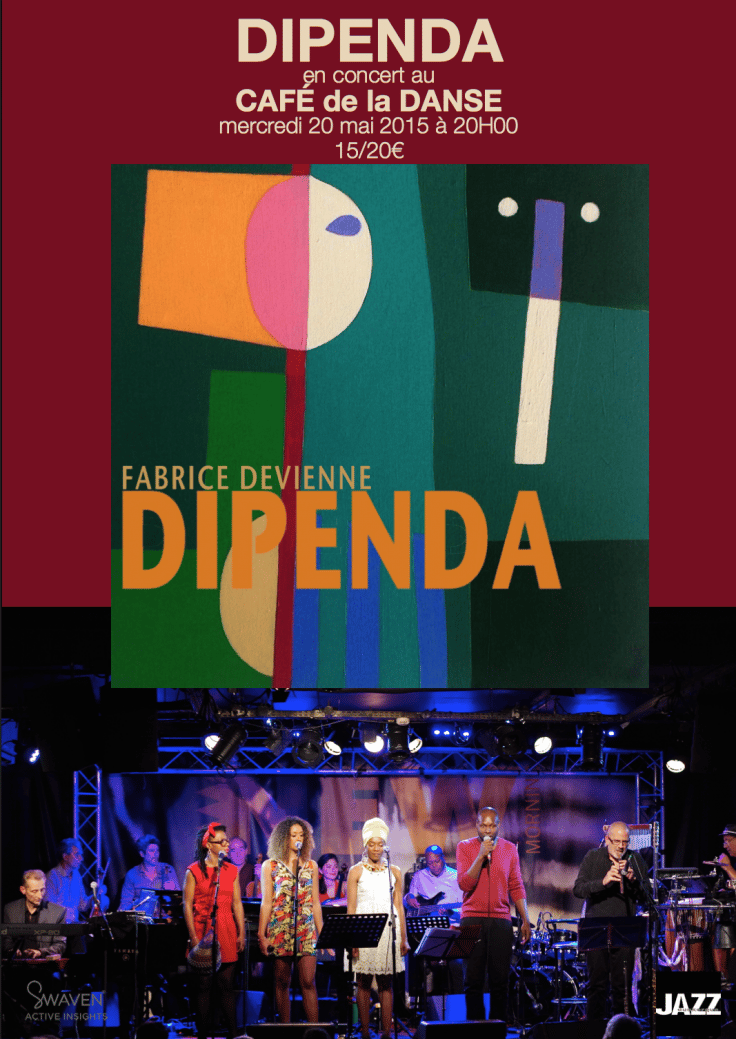 Le projet DIPENDA (« indépendance » en lingala) est né d’une réelle aspiration à faire revivre les compositions musicales de Fabrice Devienne, écrites pour la pièce de théâtre Une Saison au Congo d’Aimé Césaire, dans le cadre cette fois-ci d’un spectacle musical. Ce projet réunit sur scène 9 musiciens, 3 chanteuses et 1 slameur. Le projet DIPENDA allie des univers musicaux aux confluences de l’Afrique, de Cuba et du jazz, aux textes poétiques et engagés de la pièce de Césaire, ainsi qu’à une réflexion plus large sur le thème de l’indépendance. Slam, chants et musiques s’accordent dans des séquences rythmées, émouvantes parfois oniriques, où se croisent et s’entrechoquent différentes langues pour renaitre autrement, dans un espace sonore nouveau, quelque part entre l’Afrique, l’Europe et les caraïbes.
