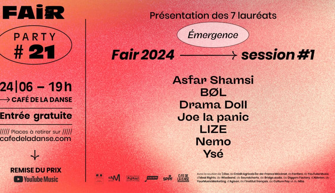 Le Fair, 1er dispositif de soutien au démarrage de carrière et de professionnalisation en musiques actuelles, est heureux de vous présenter ses nouveaux lauréats lors de sa 21ème « Fair : party » au Café De la Danse.