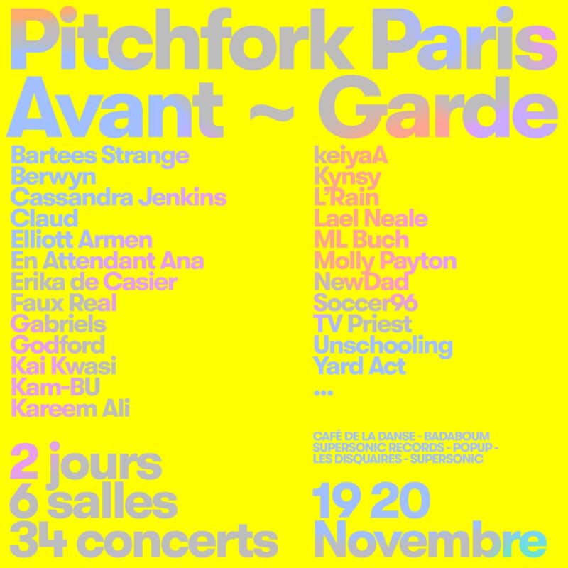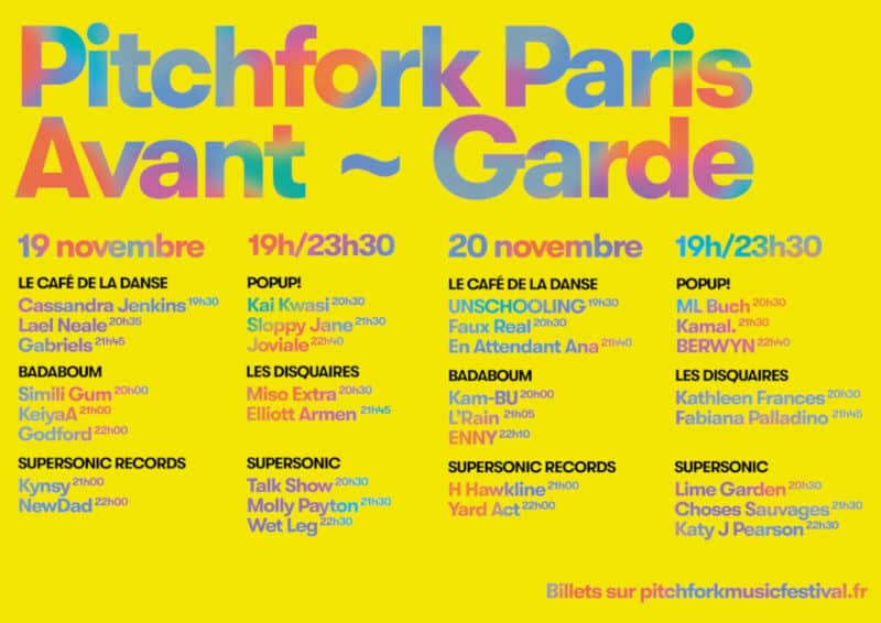 Rendez-vous au Pitchfork Music Festival Paris du 15 au 21 novembre 2021 dans tout Paris ! Une semaine d’évènements pour découvrir les artistes les plus excitants du moment. Le festival continuer d’appuyer son côté prescripteur et défricheur en invitant 17 artistes à jouer dans 6 salles du quartier Bastille avec Pitchfork Avant-Garde