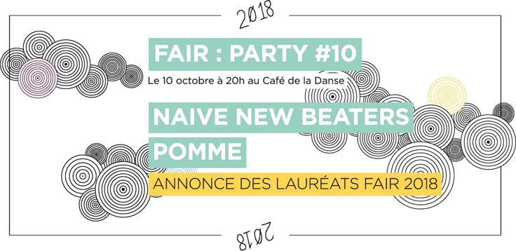 Le fair, 1er dispositif de soutien au démarrage de carrière et de professionnalisation en musiques actuelles, est heureux de vous convier le 10 octobre prochain à sa 10ème « fair : party » au Café de la Danse. L’occasion de vous dévoiler les noms des 15 nouveaux talents de la promotion fair 2018, qui bénéficieront cette année d’un accompagnement complet dans le développement de leur projet, avant une soirée de concerts ! Cette annonce sera accompagnée de 2 concerts : Pomme (lauréate fair 2017) et Naive New Beaters (parrains de la promotion fair 2018, et lauréats fair 2009).