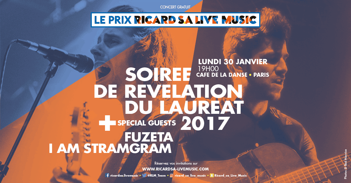 Pour fêter la nouvelle année et la fin du suspense comme il se doit, Ricard S.A Live Music vous invite au Café de la Danse lundi 30 janvier 2017 afin de connaître le nom du Lauréat 2017 qui aura été désigné par son jury. Et parce qu’accompagnement rime avec fidélité, le vainqueur 2017 pourra compter sur le soutien des anciens Lauréats, FUZETA et I AM STRAMGRAM, sur scène pour cette soirée gratuite. Mais attention : qui dit engouement dit places limitées, réservez dès-maintenant votre invitation sur www.ricardsa-livemusic.com !
