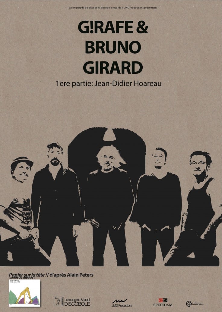 Après son premier EP L’ami que j’aimais bien (2015), G!rafe livre son nouvel opus PANIER SUR LA TETE, album profond et tranchant à l’image des textes du poète et chanteur Alain Peters (1952-1995). La musique à fleur de peau de G!RAFE s’inspire de la fulgurance imagée du créole réunionnais incarnée par la voix grave et chantante de Bruno Girard (Bratsch, Yat).