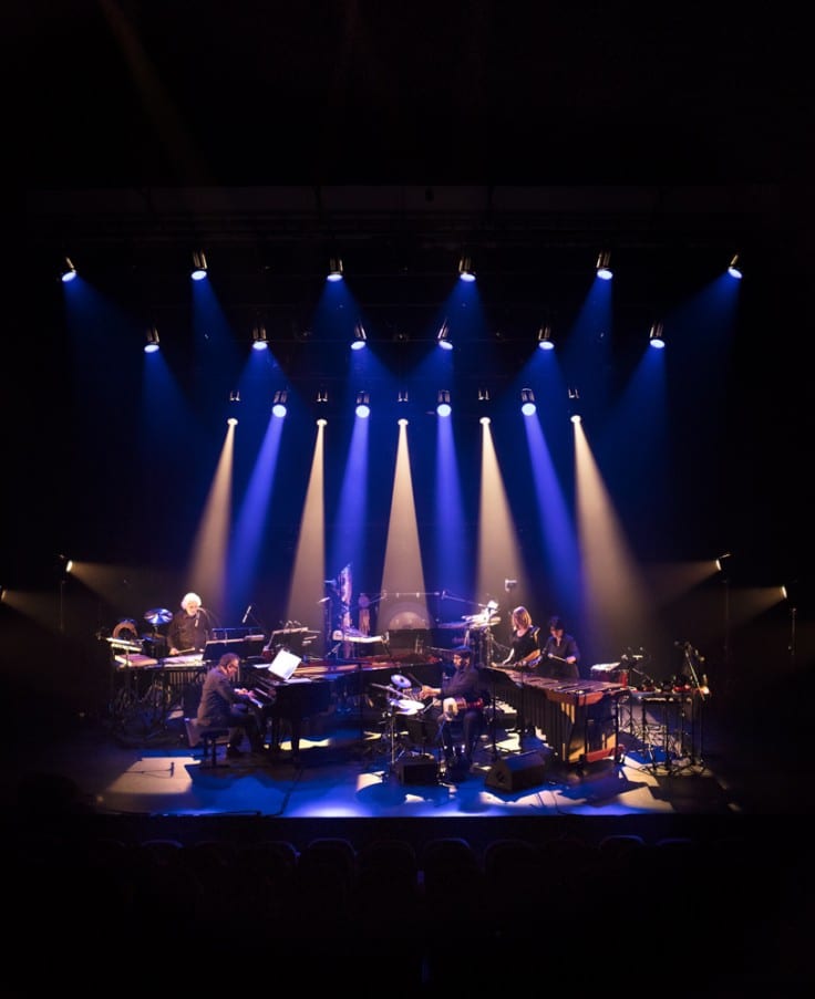 Jean-Marie Machado a réunit sur scène un orchestre composé uniquement de percussions. Tout ce qui se frappe, se frotte, se heurte, se pince, se gratte, se râcle est sur la scène. Nous sommes au paradis des percussions. Il y a là : marimbas, des xylophones, glockenspiel, vibraphone, des cymbales (chaque percussioniste en a une ou plusieurs), des cloches (bambous ou coquillage, ou autres) des bols tibétains, et de multiples tambours. Ces percussions rassemblent peau, bois, métal ce qui donne des mélanges de sons, de timbres, de textures. La musique passe par plusieurs état : des moments d’intimité et d’autres moments qui convoquent la pleine puissance des percussions.