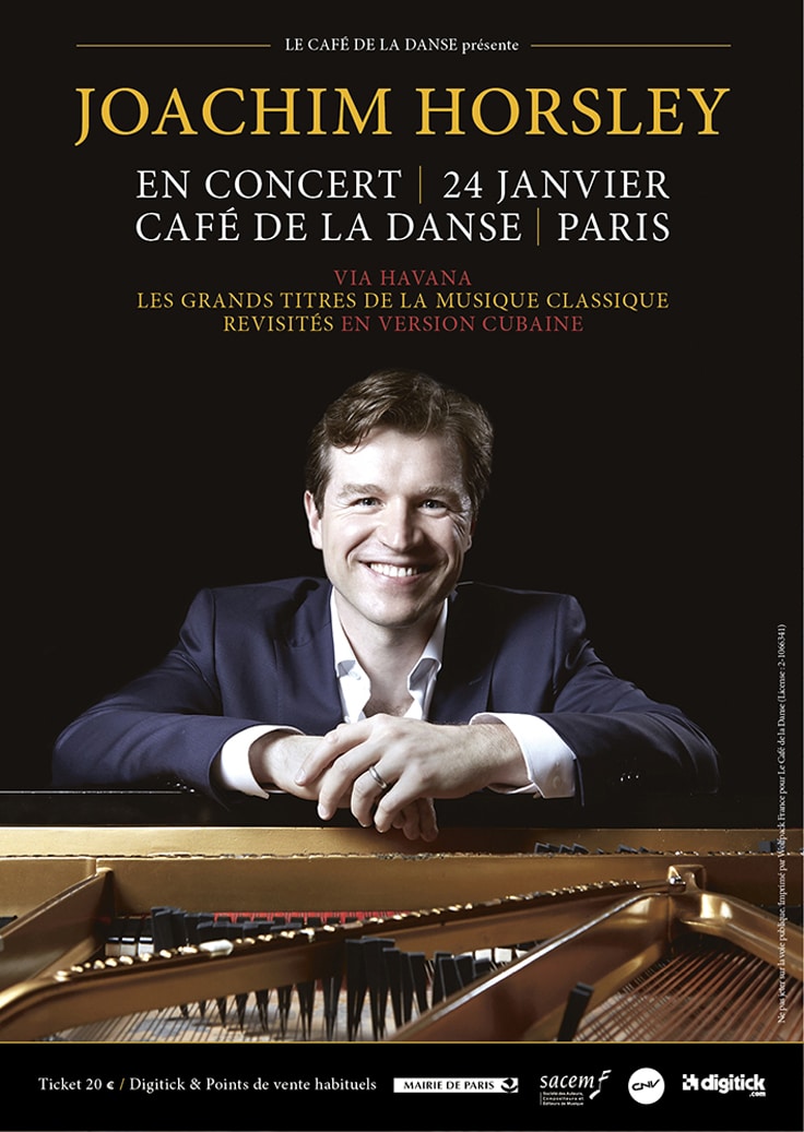 Depuis un an, près de 10 millions d’internautes ont plébiscité Joachim Horsley pour sa version « cubanisée » du 2ème mouvement de la 7ème symphonie de Beethoven. Multi instrumentiste, compositeur, auteur, chef d’orchestre, arrangeur, Joachim Horsley use de son instrument de prédilection, le piano, pour faire voyager son public hors de toutes frontières musicales. Après ses collaborations avec des artistes comme John Legend, Michael Bublé, des compositions originales pour les films « Ouija », « The possession » ou « Rabbit Hole », Joachim Horsley dévoile son projet solo mêlant musique classique et sons cubains sur certaines compositions des plus grands compositeurs. Beethoven, Shostakovich, Mahler et Rimsky-Korsakov voyagent sur des rythmes de rumba pour célébrer les possibilités ouvertes par la musique et inspirer la curiosité à son public. Son premier album « Via Havana » sera disponible le 15 février 2019 (La Café / Wagram Music). https://www.joachimhorsley.com/
