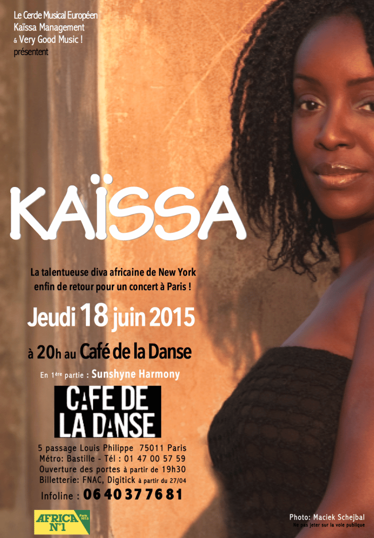 La Camerounaise, New Yorkaise depuis 19 ans, héritière de la grande lignée des divas africaines, est l’une des représentantes les plus talentueuses de la musique africaine dans le monde. Issue d’une famille d’artistes, la chanteuse primée s’est produite sur les plus prestigieuses scènes musicales. Invitée par Paul Simon à chanter en soliste pour la rétrospective de sa carrière, Diana Ross et David Byrne ont également régulièrement sollicité sa collaboration. Kaïssa a débuté à Paris en tant que choriste et soliste avec notamment CharlElie Couture, Charles Ewanjé, Papa Wemba, Salif Keïta, Jean-Michel Jarre, Césaria Evora et Manu Dibango. Après un concert intimiste donné au Sunset en Décembre 2014, Kaïssa revient chanter à Paris à la demande de ses fans, mais aussi pour conquérir un nouveau public et développer sa carrière internationale. L’enregistrement d’un nouveau CD est prévu pour 2016.