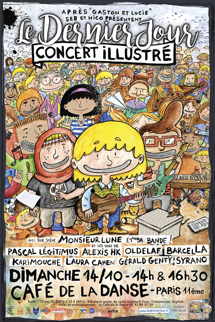 Le spectacle du Dernier Jour est un concert illustré mélant chansons joués en live, bande son cinématographique et projection vidéos de dessins animés. Les musiciens chanteurs prendront tour à tour le relais de la bande son en interprétant les différents personnages de l’histoire soutenu par l’animation des dessins. Un décor simple fait de boîtes lumineuses sur lesquelles sont inscrits les noms des personnages.