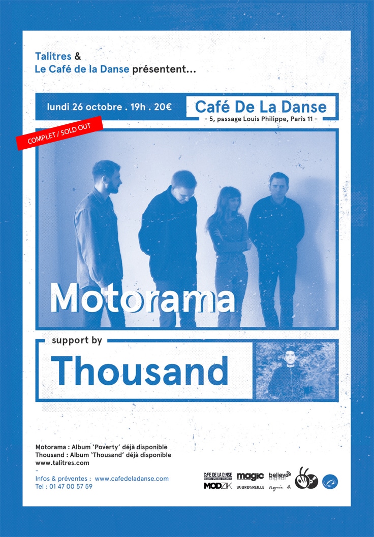 Le Café de la Danse vous accueille dans une nouvelle configuration. A la suite des travaux réalisés à l’été 2015, la salle propose deux types de placement : entièrement debout ou assis/debout. A l’occasion du concert de MOTORAMA + THOUSAND, le Café de la Danse sera en configuration debout.