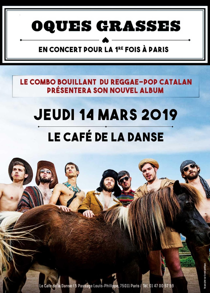 Groupe extrêmement populaire sur la scène explosive barcelonaise, Oques Grasses (« les Oies Grasses ») dynamite la chanson reggae-pop-folk avec un humour corrosif et une énergie euphorisante. Rassemblant sept membres issus pour la majorité de l’Ecole Supérieure de Musique de Catalogne, ce combo groovy s’est fait repérer par ses concerts sautillants arrosés de chants populaires, de mélodies entêtantes et de riffs de cuivres brûlants. Les sept artistes savent que sur scène, il faut faire preuve d’humour pour régaler le public. Bien souvent, le haut tombe pendant leurs concerts… Pour autant, Josep Montero, le leader, écrit les paroles avec une sensibilité certaine, abordant le quotidien, le sexe et l’amour. La promesse d’un show torride et festif, mijoté à la sauce catalane… ! https://www.facebook.com/OquesGrasses/