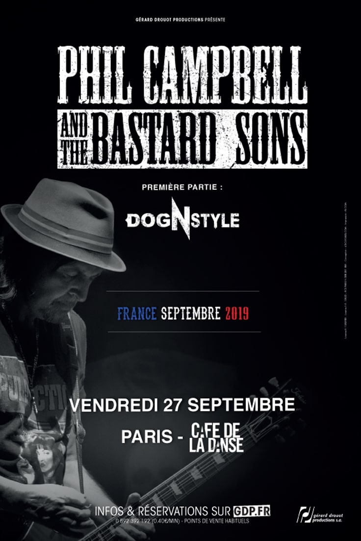 Phil Campbell and the Bastard Sons, composé de Phil Campbell (guitare) et ex Motörhead, mais aussi de ses trois fils, Todd Campbell (guitare), Dane Campbell (batterie) et Tyla Campbell (basse), mais aussi du chanteur Neil Starr, revient en tournée en France en septembre 2019. En novembre 2016, les musiciens sortent leur premier EP et se produisent dans toute l’Europe en première partie de SAXON (novembre/décembre 2016) et des GUNS N’ ROSES (juin 2017). Ils envahissent les scènes des plus gros festivals européens : Hellfest, Sweden Rock, ou encore Download. Depuis, ils n’arrêtent plus ! Leur premier album The Age Of Absurdity sort en janvier 2018. Un disque qu’ils jouent sur scène avec les meilleurs titres de Motörhead, écrits par Phil Campbell lui-même. Attendez-vous à un set résolument rock’n Roll. Comment pouvait-il en être autrement quand on sait que ce guitar hero a officié dans la bande de Lemmy pendant 32 ans ! Sur scène, la justesse du chant de Neil Starr est remarquable et la ferveur s’empare rapidement du public lorsque les titres de Motörhead sont envoyés tout en puissance. Les riffs toujours aussi frénétiques de Phil Campbell sont révélés par ses talentueux fils : c’est une véritable explosion musicale sur scène. Ne manquez pas le retour du groupe en septembre 2019 ! http://www.philcampbell.net/
