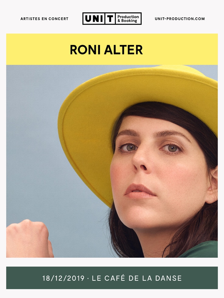 Roni Alter, auteur, compositeur, musicienne et interprète dégage une sensibilité unique ; Originaire de Tel Aviv, elle vit désormais à Paris. Mélodies riches, grain de voix unique et aérien, poétique et mélancolique, elle propose un univers inspirant et inspiré, un voyage qui vous transporte dès les 1res notes. Elle s’est entourée de Clément Ducol à la réalisation (Camille, Christophe, Vincent Delerm, Vianney etc.) et Maxim Leguil au mix (Camille, Vianney, Radiohead, Justice, Christine & The Queens, Melody Gardot etc.).