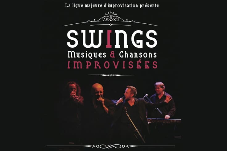 Swings donne du tempo à l’impro ! Deux comédiens chanteurs et trois musiciens improvisent ensemble, à partir des propositions du public : reggae, rock, valse, java, slow, ballade, country, blues… tous les styles musicaux sont permis. Un spectacle d’improvisation chantée unique en France !!! avec Richard Perret, Laurent Dubois, Simon Fache, Jacques Schaab et Xavier Van Rechem