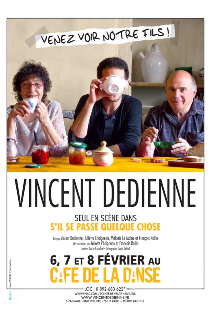 Ce jeune acteur au parcours classique réconcilie théâtre et one-man-show en livrant avec « S’il se passe quelque chose » un autoportrait à la fois drôle et sensible. « S’il se passe quelque chose, c’est un spectacle. C’est aussi un peu comme un pot-au-feu…Mais ça ressemble quand même plus à un spectacle ! Disons que ça ressemble à un spectacle qui me ressemblerait. J’ai choisi les meilleurs morceaux de moi (la partie tendre !), je les ai cuisinés pour vous et maintenant je vous invite à ma table, pour me goûter. S’il se passe quelque chose, ça ne se mange pas mais presque… Réservez ! (Si vous n’aimez pas, je vous ferai une salade). » Vincent Dedienne.