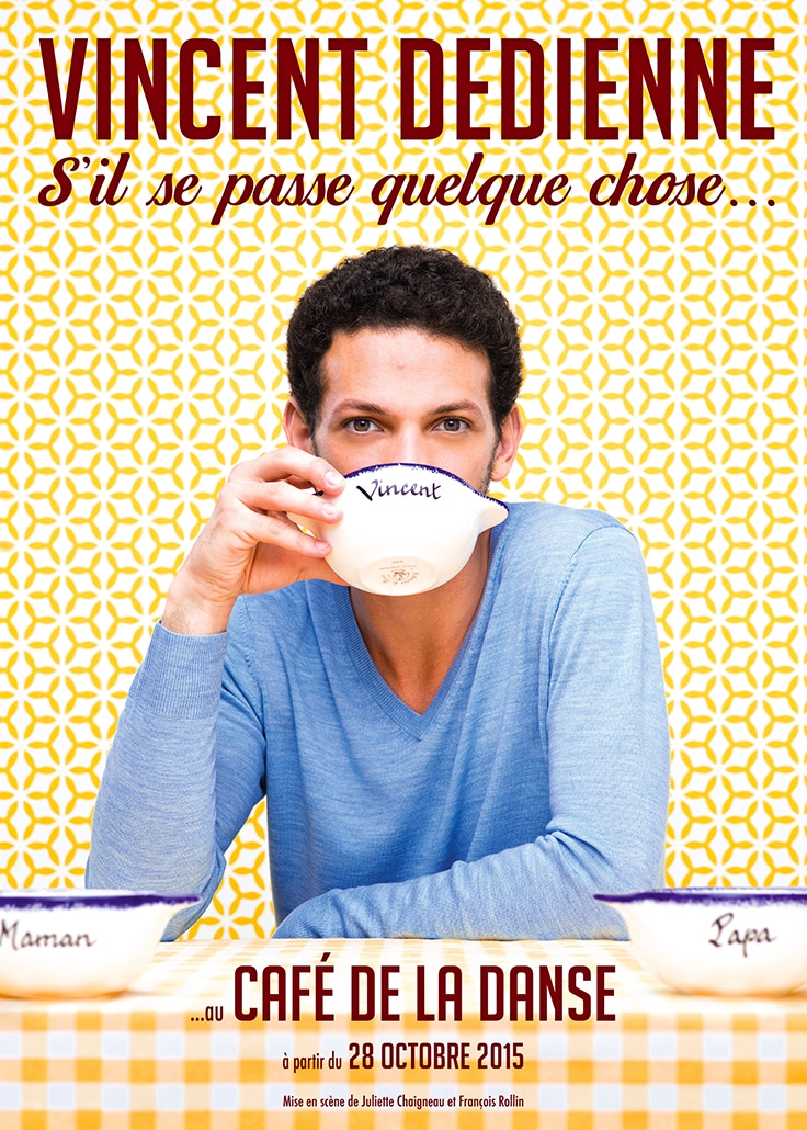 Bonjour ! Je m’appelle Vincent Dedienne et je suis la personne qui boit un chocolat chaud/thé vert bio/soupe à l’oignon sur l’affiche !