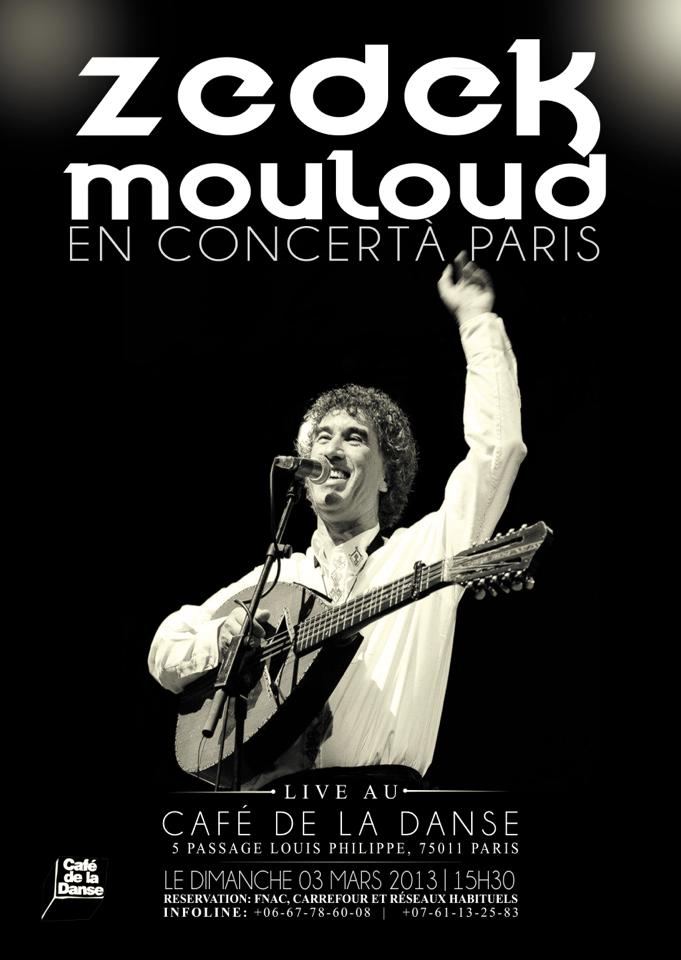 Zedek Mouloud poursuit son aventure des mots depuis une trentaine d’année. Soucieux de la fragilité des mots et des êtres, il explore les contrées d’une langue enfouie dans l’oubli, l’interdit et l’amour à réinventer et ce, afin de leur donner un nouveau souffle, un nouvel envol. Après son dernier passage triomphal au Cabaret Sauvage et à l’occasion de la sortie de son dernier album : « Juste un chemin » (Dabrid kkan) en été 2012, il sera sur la scène du Café de la Danse le 3 mars à 15H30.